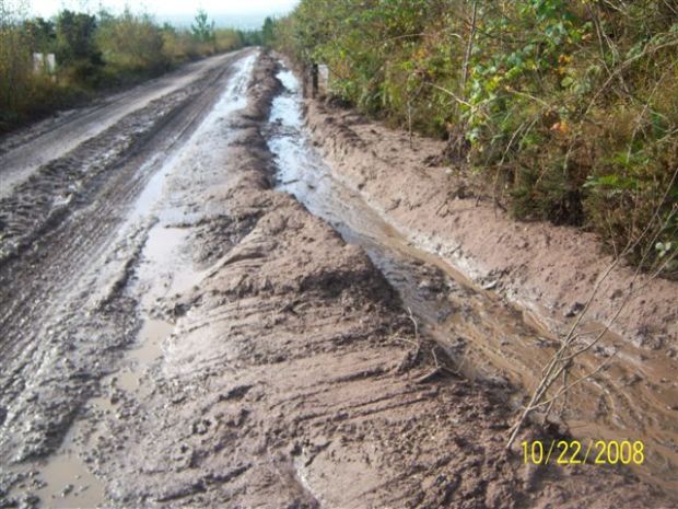 This mess photographed above should not have happened, of course, but what is more worrying is that there is no machinery on site trying to clean up. A digger should be present lifting the mud out of the ditch and scraping the road at least. Silt traps are a method of repair but the ones needed here would have to be pretty substantial. It seems clear that forwarding and haulage have continued in circumstances when it should not have.