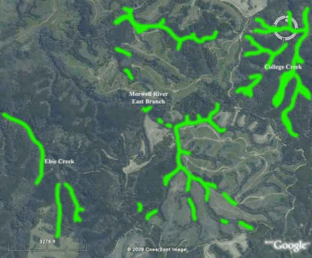 Strzelecki Ranges Morwell River East Branch, with cool temperate rainforest marked in green. The rainforest in the Morwell River East Branch catchment is of regional conservation significance and should have been granted eucalypt buffers of at least 60m. Instead Hancock have granted buffers <20m. All of the catchment has been logged since 2004, and all has been logged under FSC certification. Endemic reforestation containing Mountain Ash, has been converted to Shining Gum, a non-endemic species in the Strzeleckis.