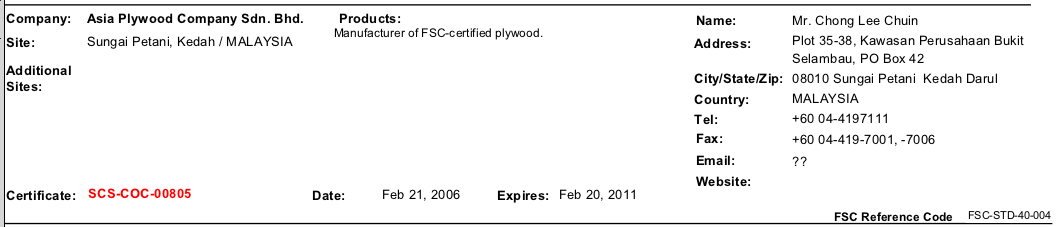 Asia Plywood Company did have an FSC chain of custody certification, from 21 February 2006 to 20 February 2011, as this screenshot from SCS’s Certified Client List dated April 2010 shows (click on the image for a larger version):