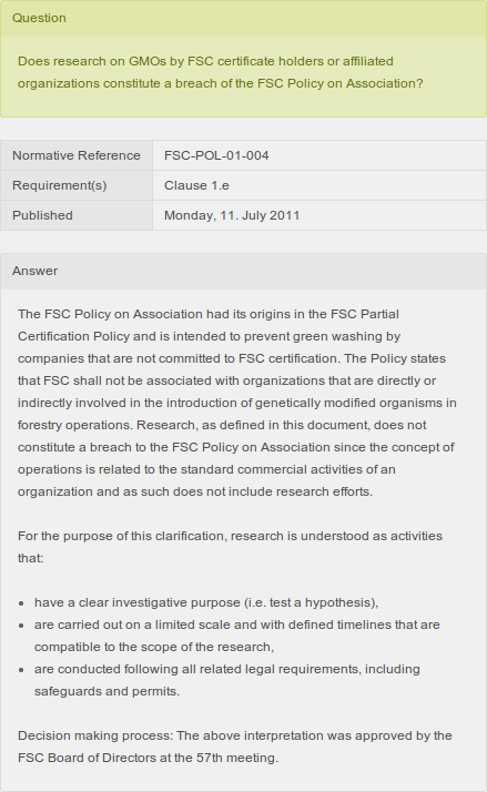 On its website, FSC clarifies that research into GE trees does not constitutes a breach of the Policy of Association: