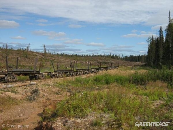 A temporary railway constructed for the transport of cut logs in the Solombabales (Konetsgorsky) concession encroaching into Dvinsky Forest (IFL). The FSC continues to certify the destruction of irreplaceable intact forest landscapes instead of supporting increased IFL protection and only certifying companies that truly practice good forest management according to FSC Principles and Criteria. Arkhangelsk Region, Russia, August 2007.