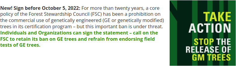 The Campaign to STOP GE Trees has written a Letter of Protest calling on FSC “to reaffirm its commitment to FSC’s current policy that prohibits the use of genetically engineered trees.”